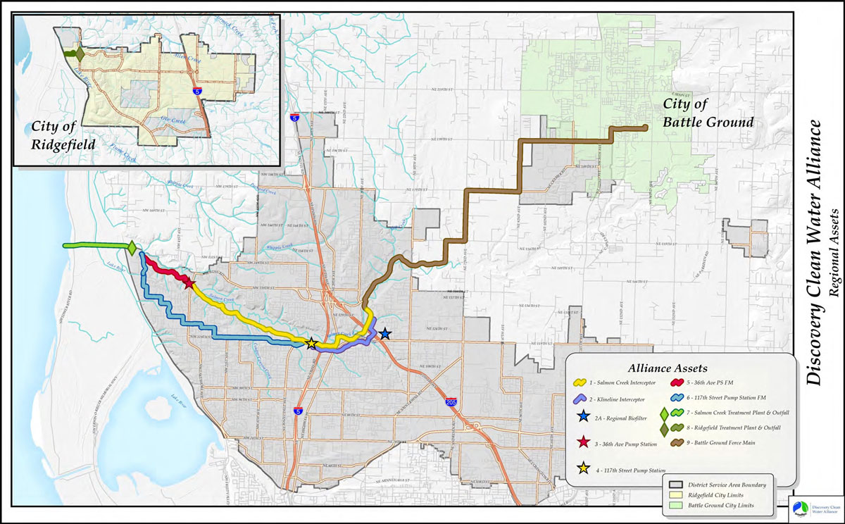 The Discovery Clean Water Alliance (Alliance), legally formed on January 4, 2013, represents the culmination of several years of evaluation to determine the optimum long-term framework for delivery of regional wastewater transmission and treatment services to the urban growth areas in the central portion of Clark County, Washington. The Alliance serves four Member agencies – the City of Battle Ground, Clark County, Clark Regional Wastewater District and the City of Ridgefield. The Members will jointly own and jointly manage regional wastewater assets under Alliance ownership through an interlocal framework established under the Joint Municipal Utility Services Act (RCW 39.106).